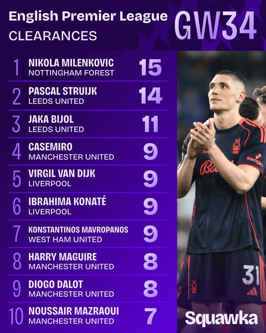虎扑04月28日讯Squawka公布了英超第34轮球员解围榜单。诺丁汉森林后卫米伦科维奇以15次位列第一,曼联4人上榜。