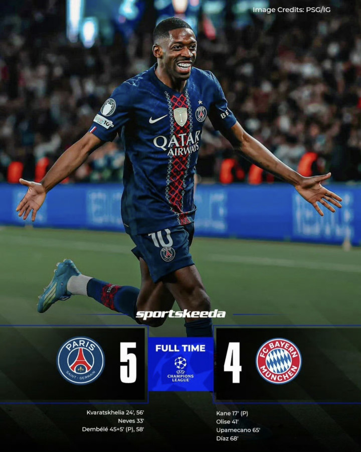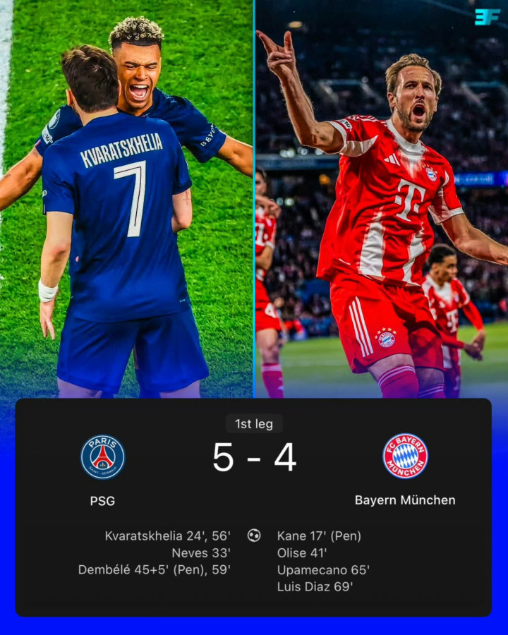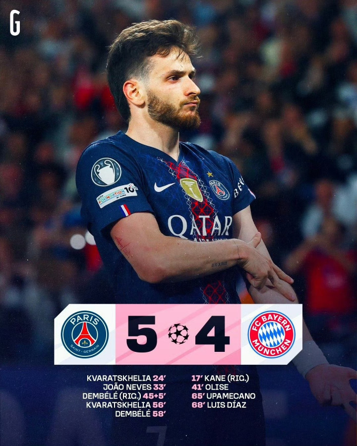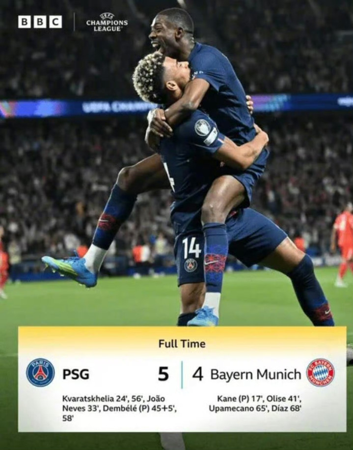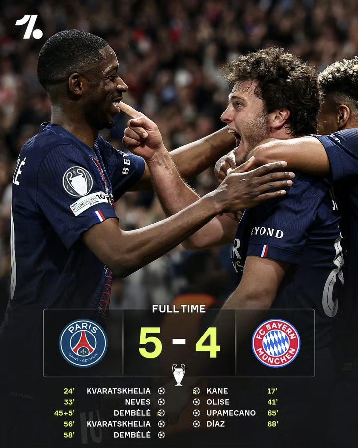 本场比赛一共打入9粒进球,来自7名不同的球员,分别是克瓦拉茨赫利亚、若昂-内维斯、登贝莱、凯恩、奥利塞、于帕梅卡诺和路易斯-迪亚斯。