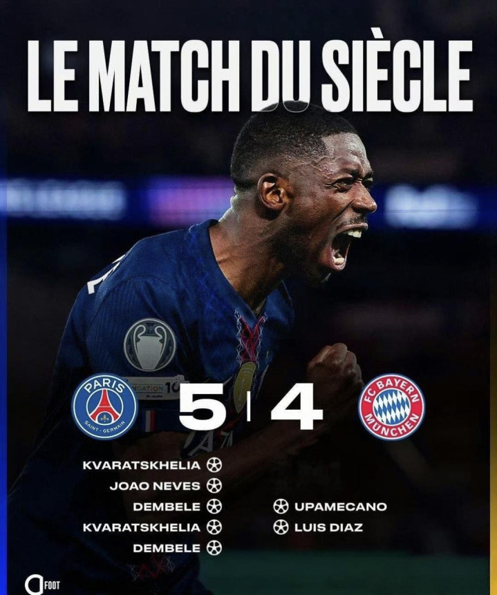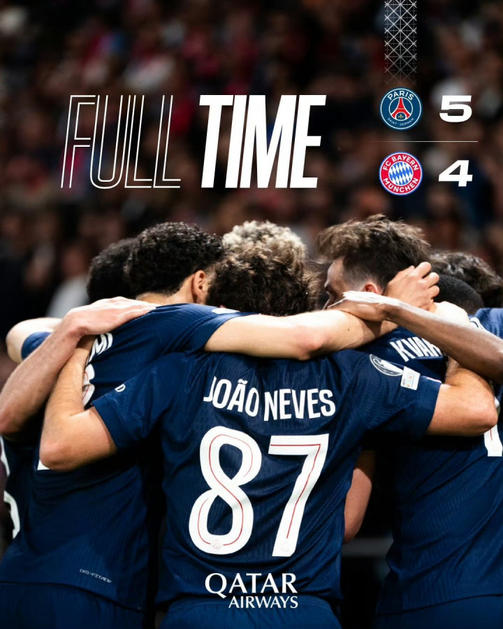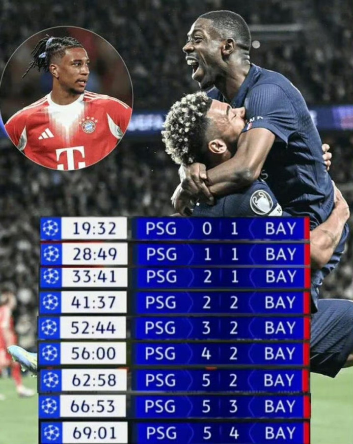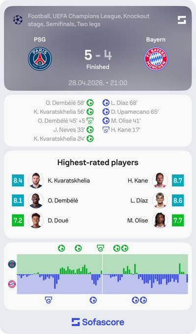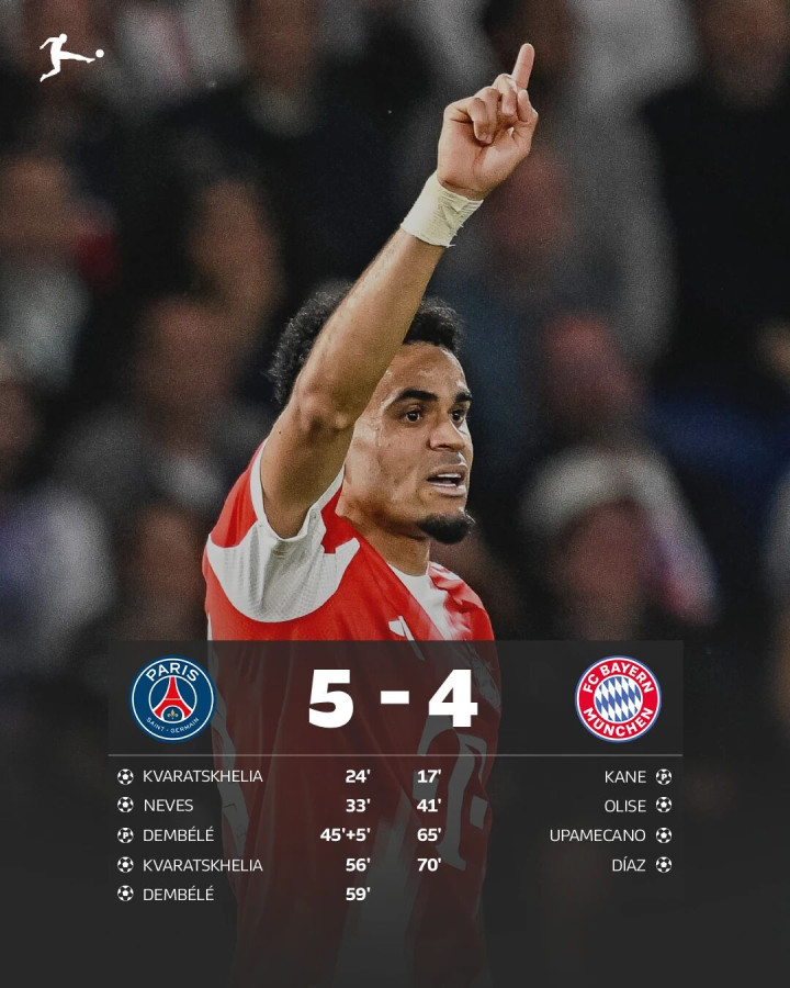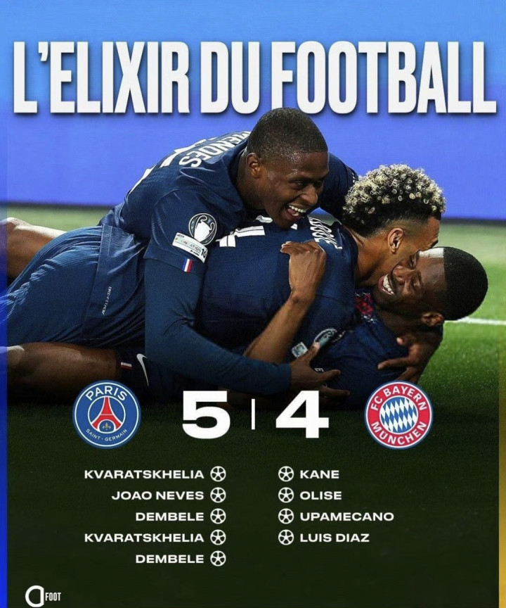 本场比赛一共打入9粒进球,来自7名不同的球员,分别是克瓦拉茨赫利亚、若昂-内维斯、登贝莱、凯恩、奥利塞、于帕梅卡诺和路易斯-迪亚斯。