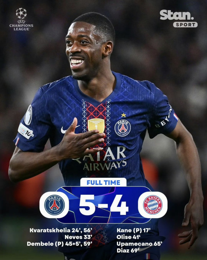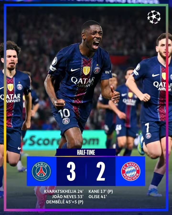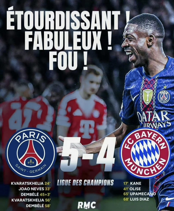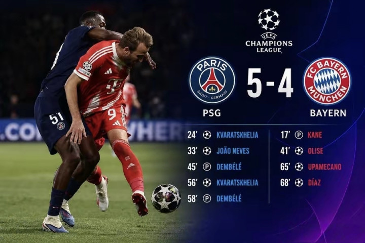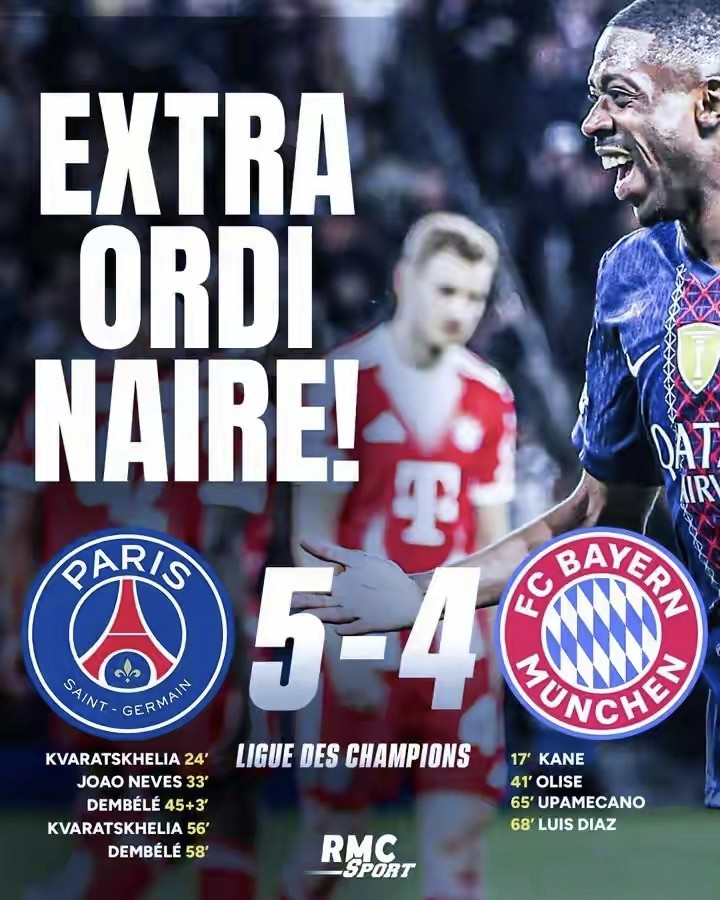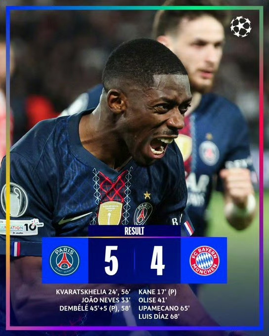 史诗级进球盛宴:凯恩传射、奥利塞爆射,金球先生登贝莱2射1传独造3球、KK双响、杜埃2助!欧冠巅峰对决,大巴黎5-4险胜拜仁