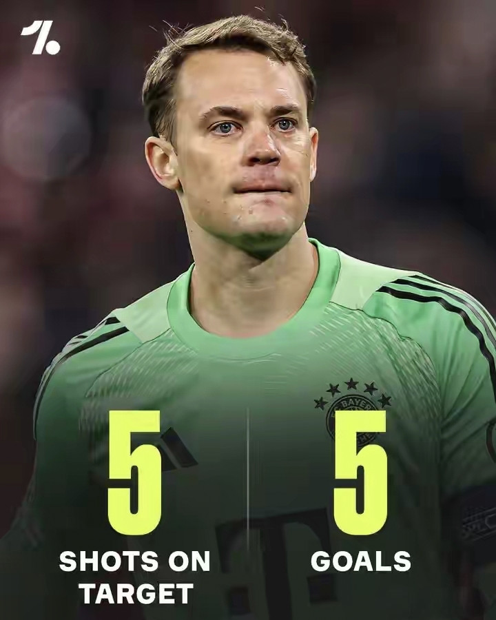 【5】 诺伊尔的噩梦!欧冠半决赛首回合,巴黎圣日耳曼主场5-4击败拜仁。巴黎全场只有5次射正,预期进球为1.91,却将5脚射正全部转化为进球,进攻效率堪称恐怖。