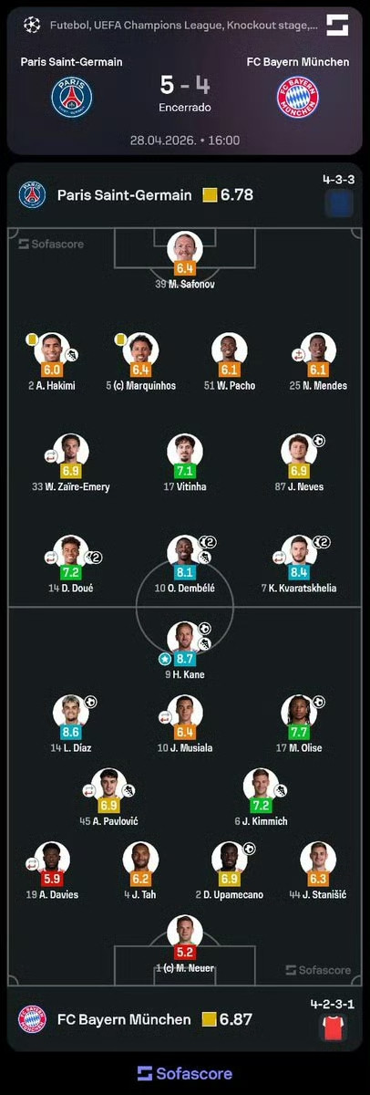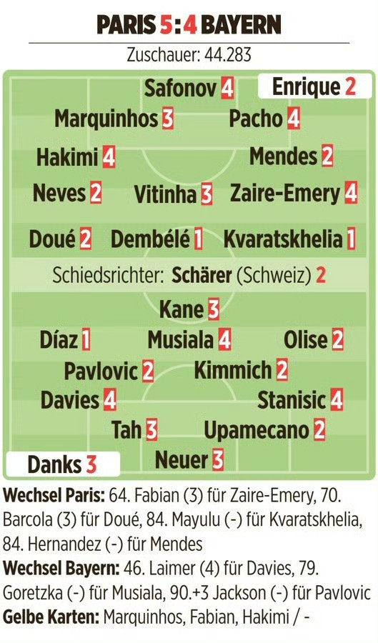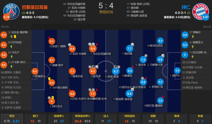 两队多名球星拿出了精彩表现,凯恩1射1传,拜仁三叉戟皆有进球,登贝莱2射1传,克瓦拉茨赫利亚梅开二度,杜埃两送助攻。全场比赛,巴黎控球43%,射门12比10,绝佳机会2比6,预期进球1.91比2.51。