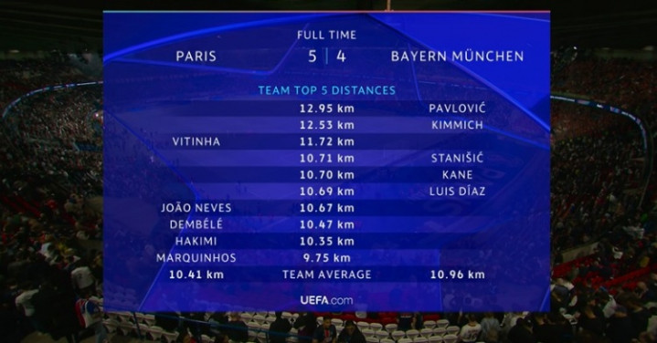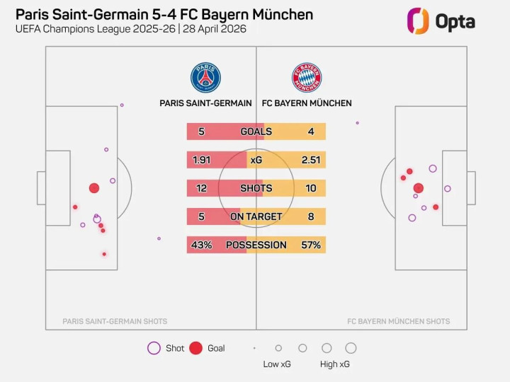全场数据方面,巴黎12射5正打进5球,拜仁10射8正打进4球。双方在实际进球上都高出预期进球不少。两队本场比赛只用了68分钟就一共打进9球。这是欧冠历史上,改制后半决赛进球最多的比赛。拜仁在多项关键统计上占优,也在一度2比5落后的不利局面下,最终将分差缩小为1球,为次回合保留了充分悬念。拜仁主帅孔帕尼表示:“现在的比分等同于0比1,下周安联竞技场将有疯狂的气氛,我们会付出一切,哪怕死在场上!”