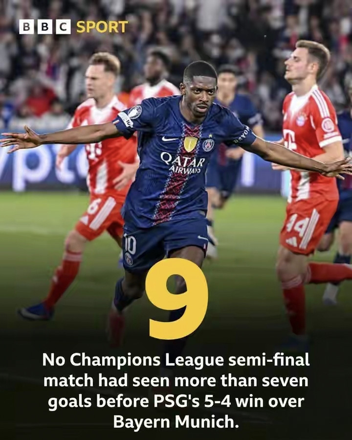 据统计,这是欧冠联赛历史上(自1992年改制以来)第二场有7名不同球员取得进球的半决赛,另一场是2024/25赛季国际米兰主场4-3巴塞罗那。