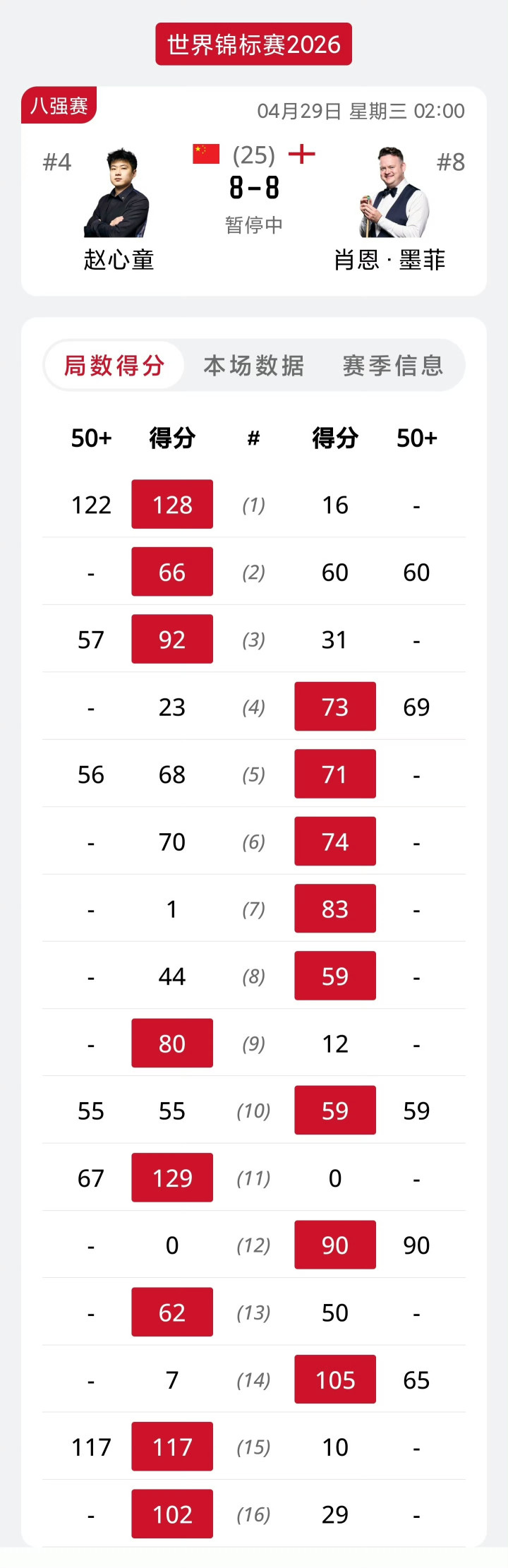 几个小时之后,今天(29日)凌晨开启的第二阶段,赵心童和墨菲延续着第一阶段的态势,双方各胜两局,墨菲7-5领先进入中场休息。休息回来,赵心童找回状态手感,凭借13局的62分、15局轰出的单杆117分、16局攻防大战中拿到的102分,顽强地将总比分扳成了8-8平,双方回到同一起跑线。
