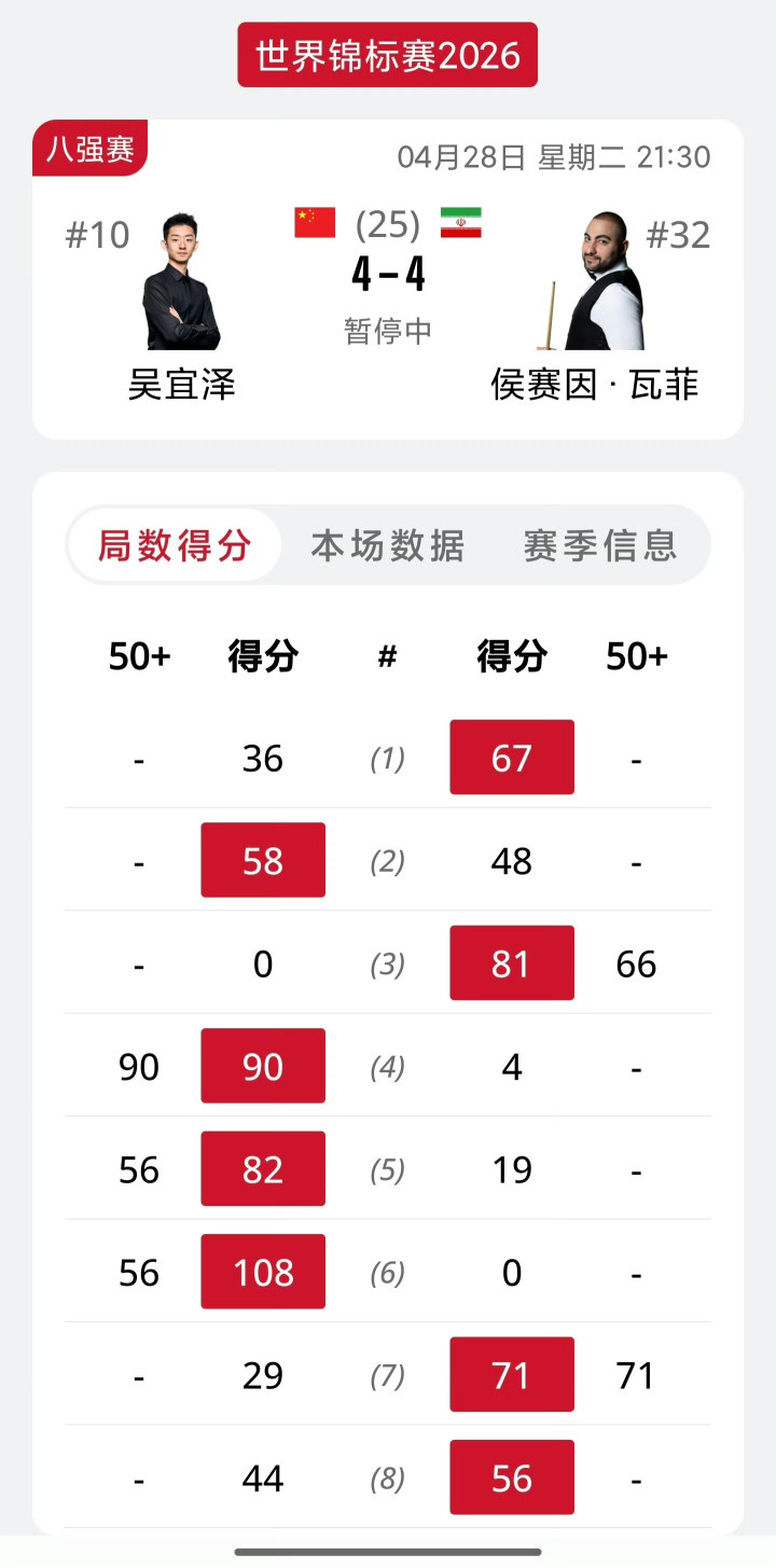 休息归来,吴宜泽连续打出两个单杆56分,将比分扩大为4-2,但瓦菲不甘示弱,凭借单杆71分和第8局的56-44,将大比分扳成4-4,二人平分结束第一阶段。