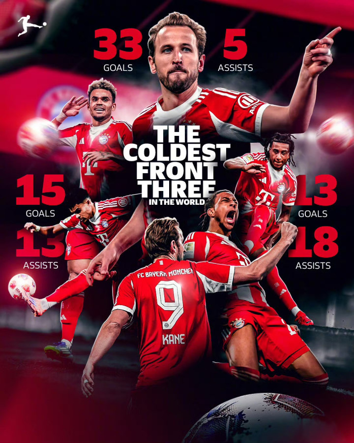 据统计,凯恩、奥利塞和迪亚斯本赛季已合计打入100粒进球。断层领先欧洲足坛“进攻三叉戟总进球榜”。