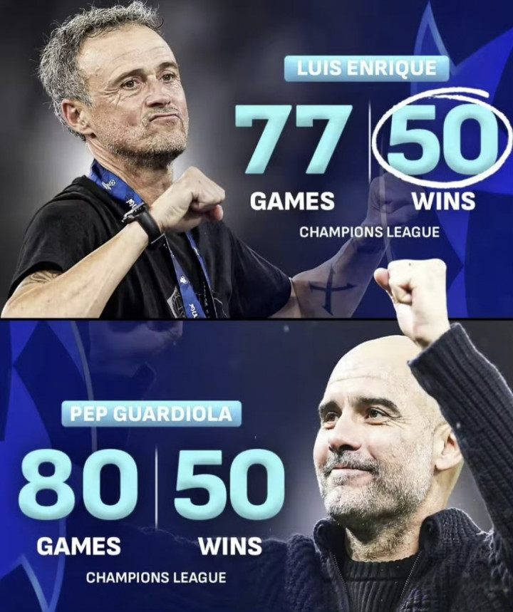 【77】欧冠历史上主帅达到50胜所需场次最少: