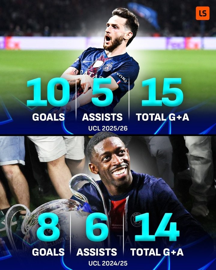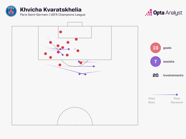 据OptaAnalyst统计,自2025年1月加盟巴黎圣日耳曼以来,克瓦拉茨赫利亚已经在欧冠赛场直接参与20粒进球,包括13粒进球和7次助攻。同期没有任何球员在欧冠中的参与进球数比他更多。
