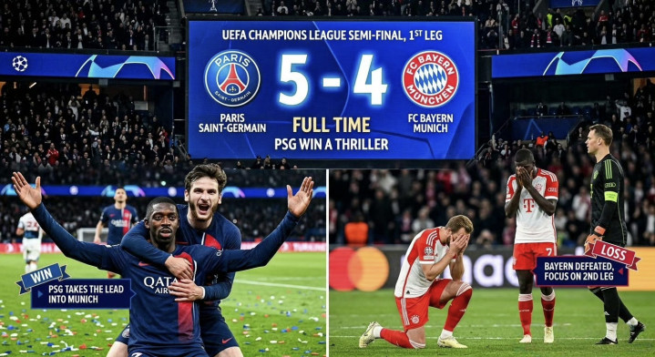 北京时间4月29日03:00,2025/26赛季欧洲足球冠军联赛半决赛首回合,巴黎圣日耳曼坐镇主场王子公园大球场迎战拜仁慕尼黑,本场比赛的主裁判是瑞士裁判沙勒。上半场,迪亚斯造点凯恩点射先拔头筹,登贝莱2失单刀+传射+造点,克瓦拉茨赫利亚、内维斯破门,奥利塞建功。易边再战,克瓦拉茨赫利亚、登贝莱再入两球双双梅开二度,于帕梅卡诺、迪亚斯也连入两球。最终全场战罢,大巴黎主场5-4险胜拜仁,守住主场优势。但两队仅有1球分差,次回合转战安联球场,拜仁仍保留极大翻盘希望,欧冠半决赛悬念依旧拉满!
