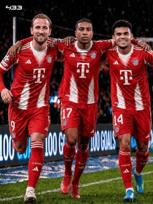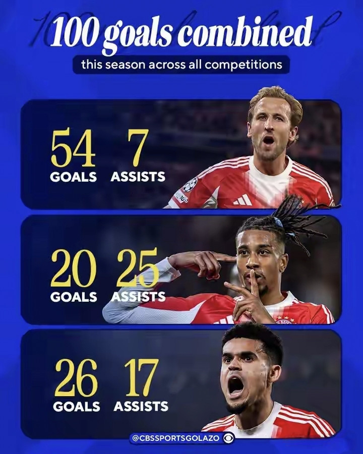 【3*20G/A】疯狂三叉戟,拜仁首次单赛季有三人欧冠参与进球上双——据统计,这是拜仁队史首次有三名球员单赛季欧冠参与进球上双。根据433的统计,在路易斯-迪亚斯破门将比分追至5-4后,拜仁前场三叉戟哈里-凯恩、路易斯-迪亚斯和奥利塞本赛季各项赛事合计已经打入了100球。